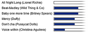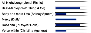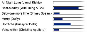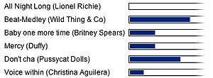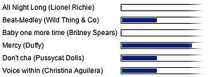 Ihr habt gewählt! Und wir haben am 15.12. unser Song-Wahllokal geschlossen. ![]() Hier das Ergebnis: Platz 1: "Beat-Medley" (Wild Thing & Co) UND "Dont' cha" mit je 25 % der Stimmen. Platz 2: "Mercy" mit 20 %. Platz 3: "Baby one more time" mit 18 %. Platz 4: "The voice within" mit 12 %. Und mit 0 Stimmen auf Platz 5: "All night long". Also werden wir wohl zwei Titel einüben... auch schön! Dann gehen wir mal ans Werk... | |