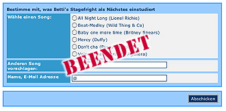![]() one... two... three... Im Oktober war's mal wieder Zeit, ein neues Musikstück in einen typischen Stagefright-Song zu verwandeln. Wir hatten eine Liste und die Qual der Wahl... und Ihr wart zur Mitarbeit aufgerufen. Vielen Dank an alle, die mit abgestimmt haben. Lohn Eurer Mühe: Unter allen Teilnehmern verlosen wir im Januar eine Private Uraufführung des Siegertitels im FMB-Studio bei einem Glas Sekt für zwei Personen |